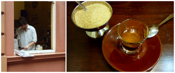 To say the staff are run off their feet is an understatement, but I’m in no hurry. Eventually a waitress rushes by and I order my macch. It doesn’t take long to arrive. It’s good, a bit on the frothy side but nice and short (you have the specify in Melbourne, otherwise you may end up with the feared long macch) and the vast old space is a nice change from the usual cramped coffee hole-in-the-wall I frequent.